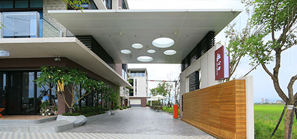 現代感的【耘心田】以機能性折版當立面主軸,讓光影作畫;巧妙地大面開窗攬景設計,收納自然與雲彩,擴大空間的延伸感;自然原木欄杆的曲線變化作裝飾,使建築具備有輕透、休閒、規律感,輔以濃蘊綠意植栽,讓她的美平易近人,經建築體驗讓人紓壓愉悅。